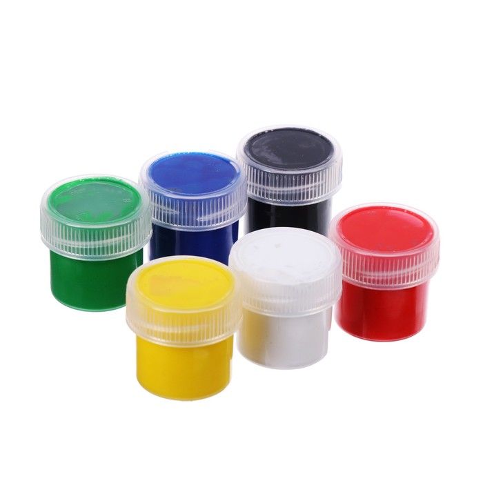 В картонной коробке 6 прозрачных пластиковых баночек с красками разных цветов (по 1 цвету). Материал подходит для рисования по стеклу, картону, бумаге.