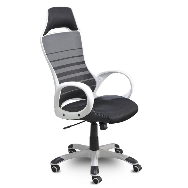 Мебель дополняется подлокотниками из пластика, спинка с подголовником обтянута сеткой. Механизм качания подстраивается под вес человека. Высота кресла изменяется, пятилучье оборудуется роликами с покрытием из полиуретана. Сиденье оформляется тканью-сеткой.