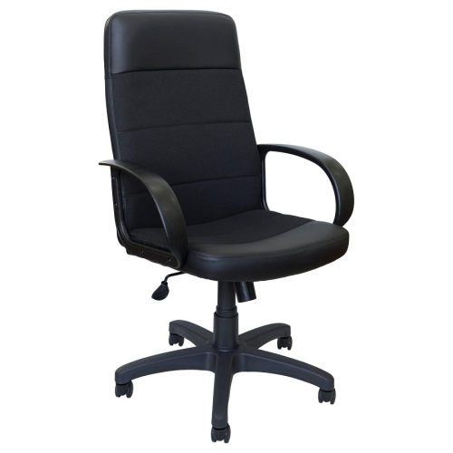 Кресло с пластиковыми подлокотниками и мягким посадочным местом подходит для работы за ПК.