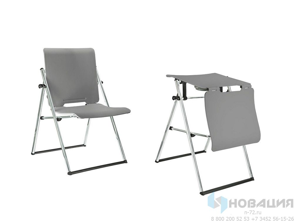 Мебель-трансформер выдерживает 120 кг. Рама из хромированного металла раскладывается. Изделие превращается в стул (сиденье 490х420 мм, спинка 610х470 мм) или выполняет функцию стола (рабочая поверхность 490х470 мм, высота над полом 750 мм). Расстояние между скрещенными опорами 680 мм. Конструкция стоит на 2-х полозьях, укреплена перекладинами.