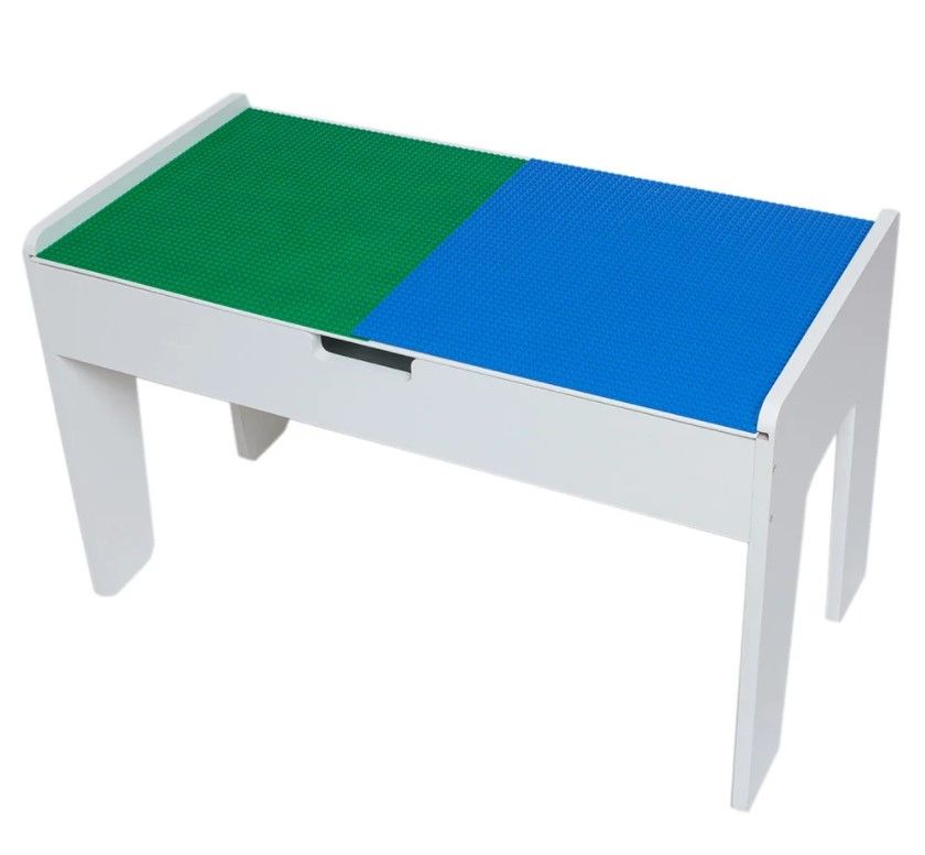 Детали хранятся внутри мебели, верхнее полотно служит рабочим полем. На крышке можно собирать конструктор, лепить, обучаться письму и чтению. Это легкая конструкция для крупных и мелких элементов. В столе помещается до 12-ти конструкторов.