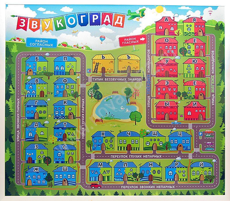 Доска оформлена в виде карты города с домами, районами гласных и согласных и улицами глухих, звонких, мягких и твердых. Каждую карточку со звуком необходимо разместить в соответствующий дом. Наглядное пособие поможет научить детей правильно составлять схемы слов, а в дальнейшем - быстро выполнять фонетический разбор слова.