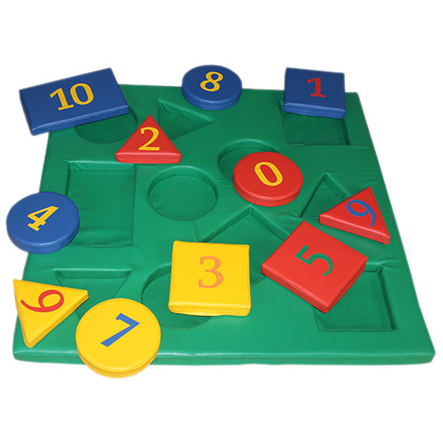 Сенсорный мат служит покрытием для пола и основой для игры: в фигурные отверстия вставляются блоки с цифрами. Элементы помогают научиться считать, различать цвета (синий, красный, желтый, зеленый), запомнить основные геометрические формы (квадрат, круг, прямоугольник, треугольник).