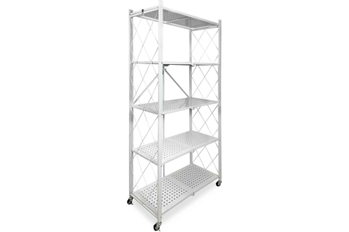 Напольный стеллаж состоит из пяти полок. Легко транспортируется, складывается и раскладывается. Оснащен четырьмя колесами, два из которых имеют стопорный механизм. Каждая полка рассчитана на нагрузку не более 15 кг.