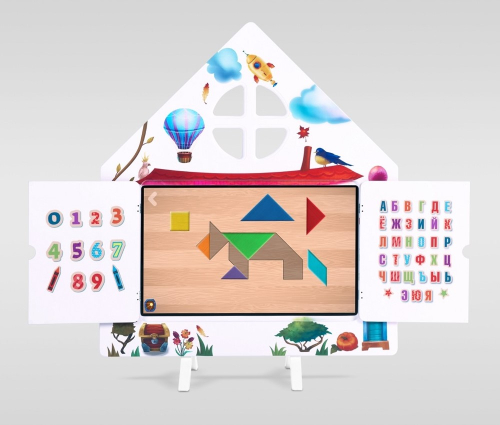 - Интерактивная настенная панель в виде теремка со ставнями, на которых нарисованы буквы и цифры (25 дюймов, Full HD, мультитач 10 касаний);