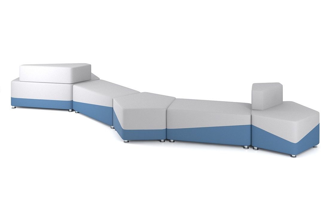 Модульная мебель составляется из пуфов разнообразной конфигурации, доступ к дивану обеспечивается с обеих сторон. Пуфы расставляются произвольно, что удобно для зон переодевания и отдыха.