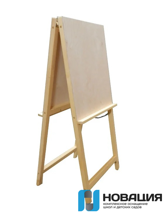 Напольный складной мольберт традиционной конструкции с двумя рамами оснащен удобной полочкой и крепежным механизмом.