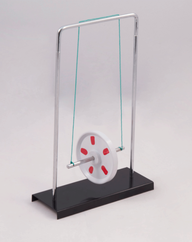 Маятник представляет собой металлический диск (диаметром 110 мм и толщиной 14 мм), посаженный на стальную ось (диаметром 8 мм и длиной 160 мм). На расстоянии 10 мм от каждого конца оси просверлены отверстия для нити. Диск подвешивается на тонкой непрерывной нити (предусмотрена в комплекте) к специальной стойке. Стойку образует массивная плоская подставка размерами 247х95х18 мм с закрепленными на ней вертикальными стержнями (длиной 385 мм и диаметром 8 мм). Верхние концы стержней соединяют поперечным металлическим стержнем. Этот стержень имеет также два сквозных отверстия, через которые пропускают непрерывную нить с закрепленным на концах маятником.