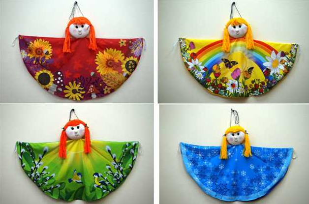 Платковая кукла выполняется из цветной ткани с живописным принтом. Наряд быстро фиксируется на шее при помощи тесьмы. Руки дошкольника вставляются в петли на платке.