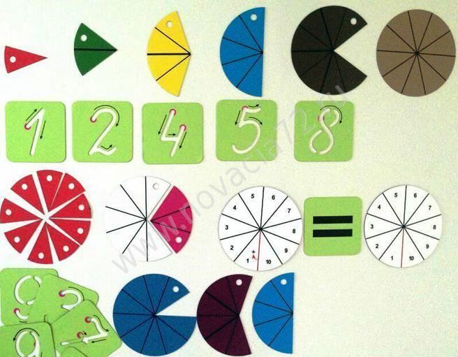 В набор входят карточки в виде равных частей круга, а также карточки с числами от 0 до 9.