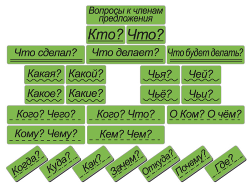 В наборе 26 карточек с вопросами, на которые отвечают различные члены предложения. Предназначен для наглядного изучения членов предложения. С помощью набора дети запомнят функции подлежащего, сказуемого, определения, дополнения и обстоятельства.