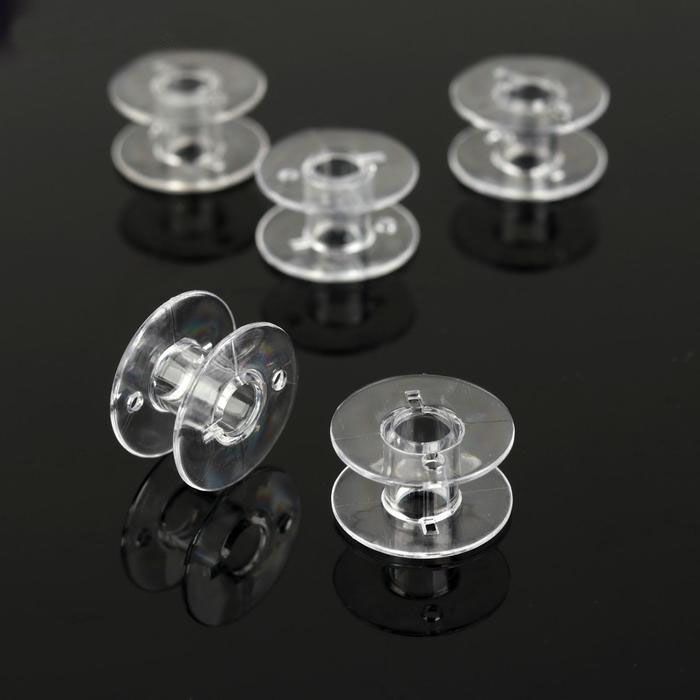 В наборе для швейной машины 5 прозрачных шпулек со внутренним диаметром 6 мм. На катушки наматывается нить. Шпульки подходят для машин Brother, Janome, Aurora, Bernette, Elna.