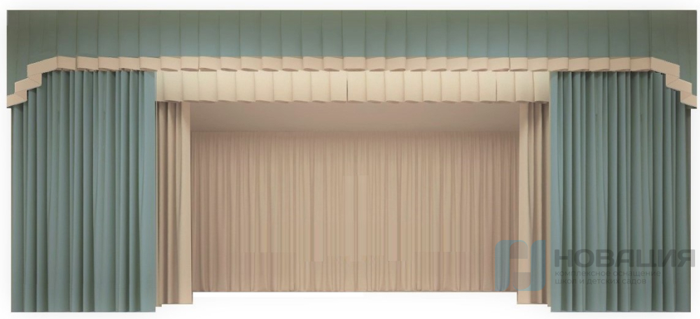 Сценическое оформление выполнено из специализированных тканей, обладающих повышенной огнеупорностью и сохраняющих свойства после стирки или химчистки.