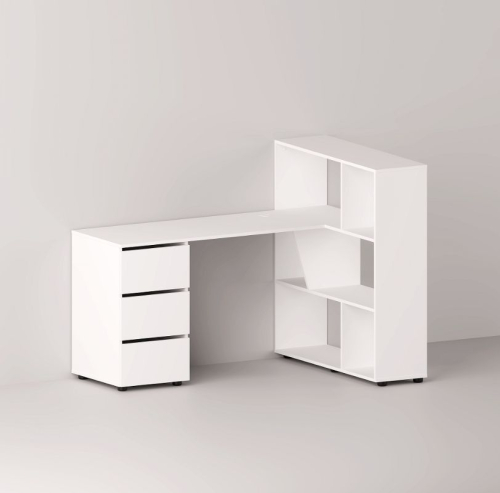 Встроенный стеллаж добавляет дополнительную полезную площадь, предполагая аккуратное размещение книг, документов и аксессуаров. Элегантный дизайн подчеркивает современность интерьера, превращая рабочее место в функциональный и стильный элемент обстановки.