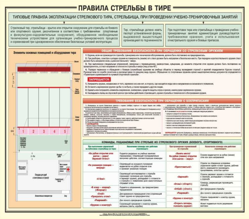 На плакате представлена общая информация о правилах стрельбы в тире: правила эксплуатации стрелкового тира, требования безопасности, назначение команд при стрельбе. Плакат покрыт двухсторонней ламинированной пленкой.
