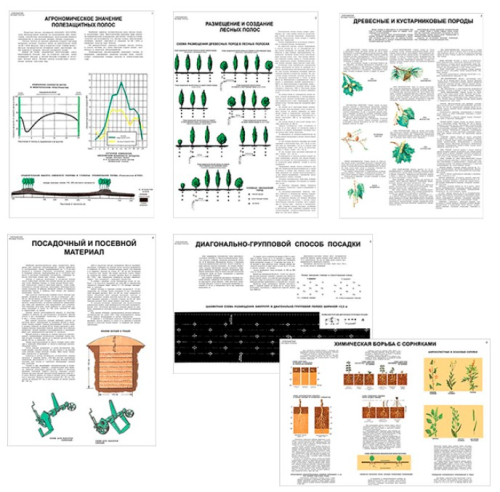 Плакаты предназначены для информирования о значении и методах создания полезащитных лесных полос, выборе пород деревьев и кустарников, а также о способах борьбы с сорняками.