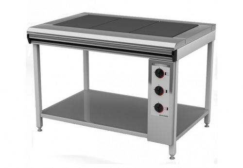 Плита на подставке с полкой имеет чугунные цельнолитые конфорки, которые обеспечивают быстрый и равномерный нагрев. Время разогрева до рабочей температуры (400°С) 30 мин. Рабочий стол плиты и лицевые панели из нержавеющей стали.