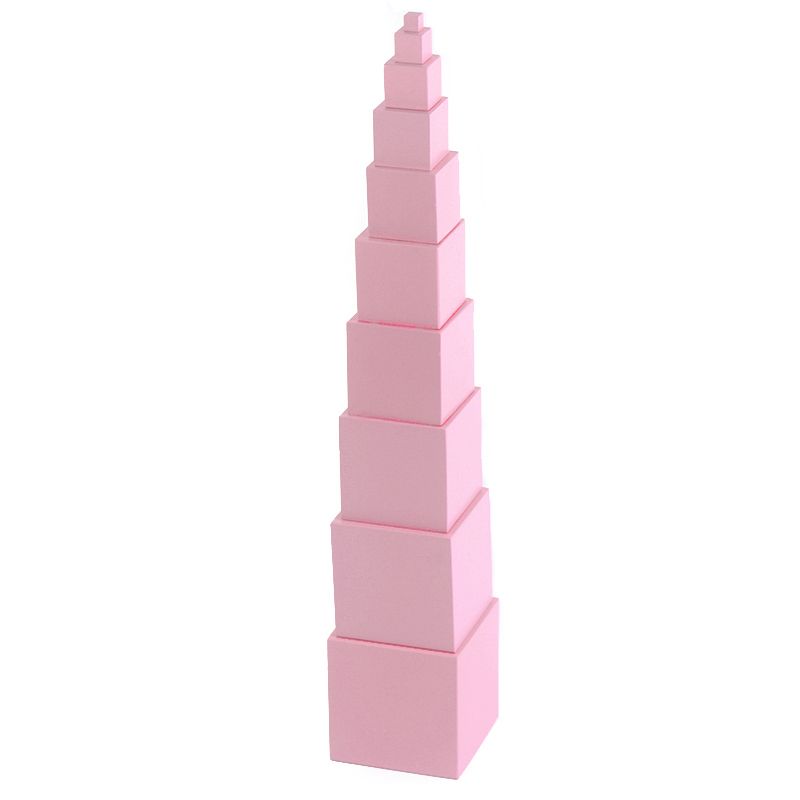 Элементы для занятий по методу Монтессори выстраиваются в башню. Стороны кубов уменьшаются постепенно, от нижней части сооружения к верхней. Это позволяет получить представление о геометрических и физических понятиях. Ребенок наблюдает за балансом конструкции, сравнивает размеры, учится считать.