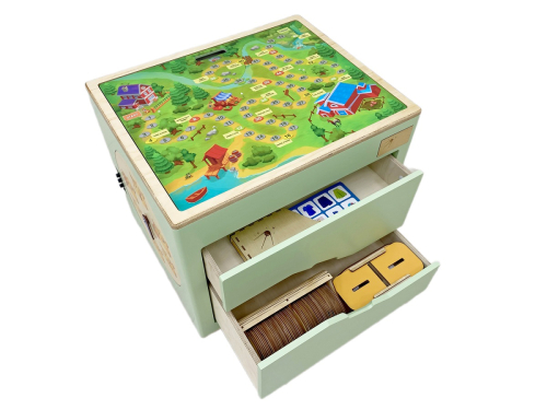Мобильный куб на колесиках легко перемещается и оснащен двумя ящиками, в которых располагаются дидактические карточки, игра «Дубль», сортеры, пазлы, лото, домино, книга First Book. В боковых частях куба размещаются бизиборды «Колесо настроения» и «Времена года», а сверху на крышке – пошаговая игра-бродилка с вопросами на английском.