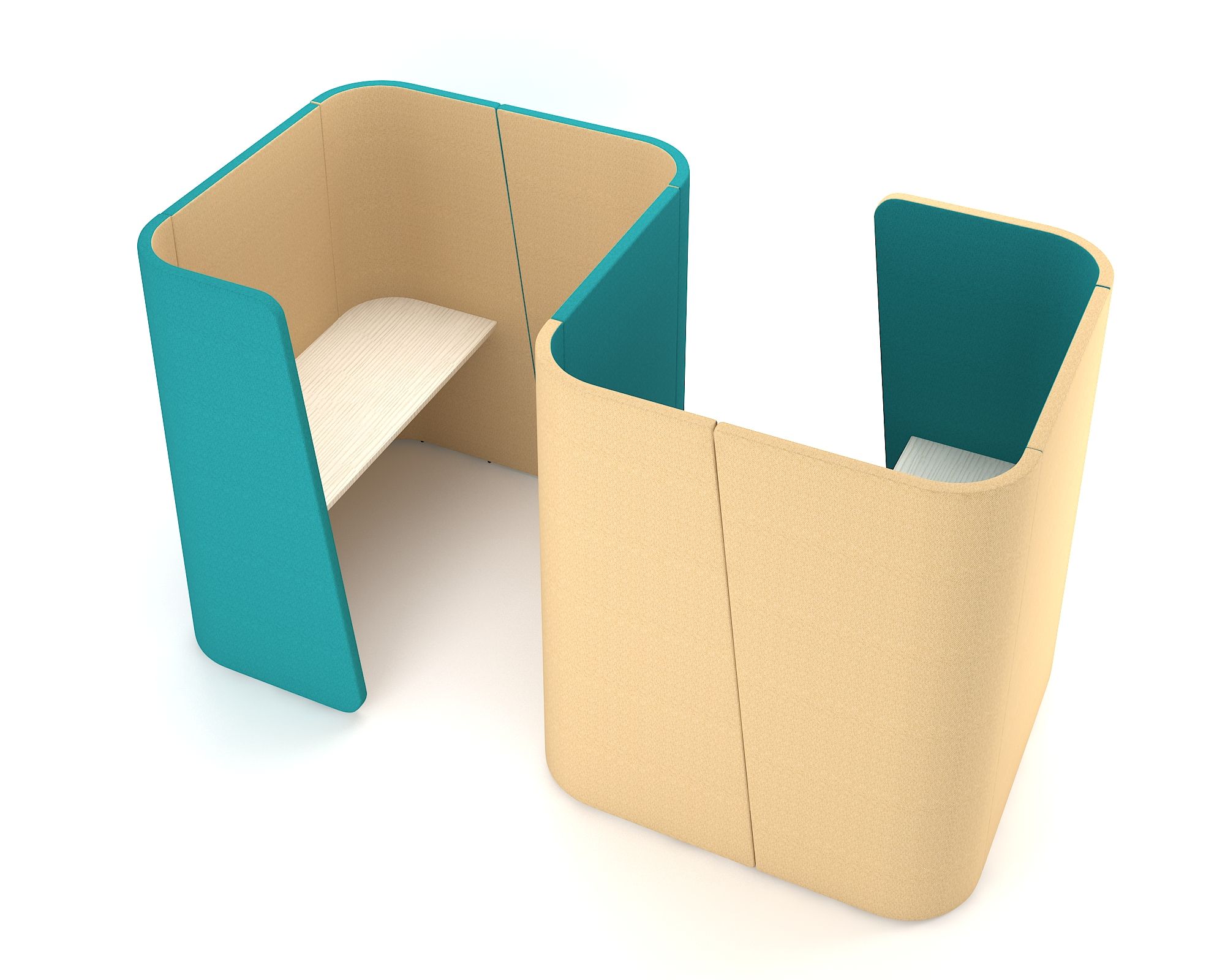 Двойное рабочее пространство подходит для создания коворкингов, мягких зон и гардеробных. Конструкция s-образной формы занимает 4,5 кв.м. Вертикальные панели образуют 2 ограниченных участка с общей стенкой и отдельными входами. На каждом участке закрепляется прямоугольная столешница из ЛДСП (25 мм). Перегородки поглощают шум. Обивка выдерживает не менее 20000 циклов истирания.