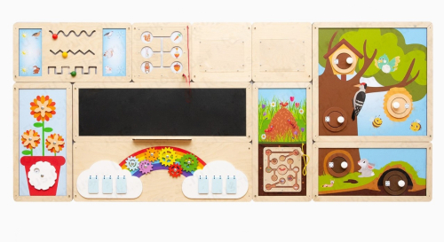 Настенная панель изготовлена из гипоаллергенных материалов. Содержит тактильные развивающие элементы: шестеренки, бегунки и пр. Позволяет изучать явления природы и погоды, мир растений и животных, смену сезонов.