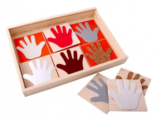Игра учит воспитанников ДОУ различать поверхности на ощупь, помогает запомнить названия пальцев.