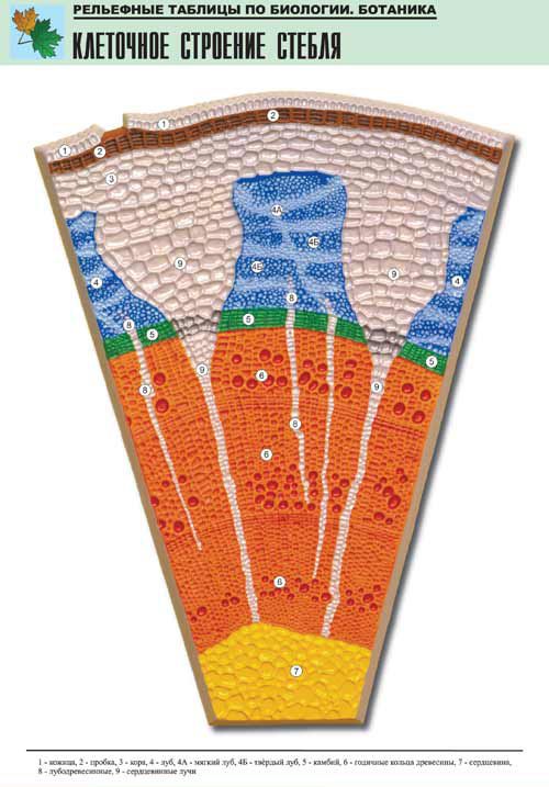 На белом фоне представлено строение стебля растения в разрезе (на клеточном уровне). Элементы схемы обозначаются разными цветами, сопровождаются поясняющей информацией. Плакат для кабинета биологии (ботаники) покрыт матовой пленкой с объемным эффектом, исключающим блики. Благодаря специальной полноцветной печати таблица выглядит рельефной.
