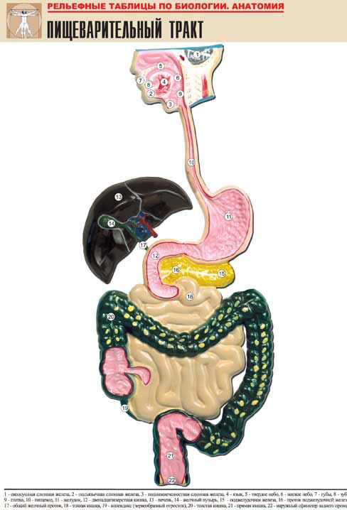 На белом фоне схематически показано расположение пищеварительных органов человека. Элементы рисунка выделены разными цветами, сопровождаются поясняющей информацией. Таблица для уроков биологии (анатомии) покрыта матовой пленкой с объемным эффектом, исключающим блики. Рисунок с полноцветной печатью выглядит рельефным.