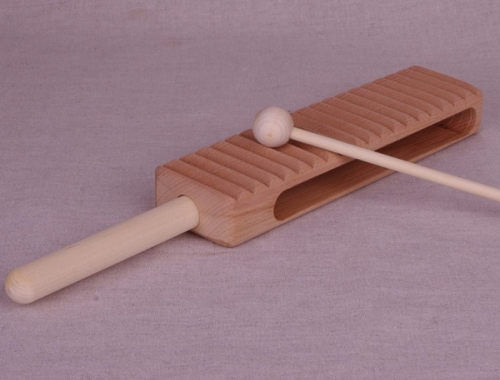 Изделие поставляется в комплекте с палочкой для игры. Ребристая поверхность колотушки с ручкой подходит для извлечения звуков. Музыкальный инструмент учит дошкольников и младших школьников воспроизводить мелодию посредством постукивания, тренирует память и координацию движений, помогает развить чувство ритма.