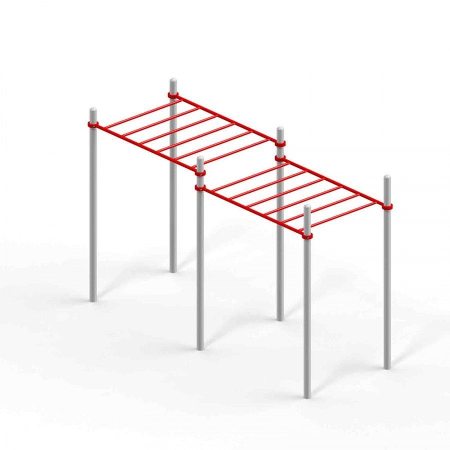 Конструкция состоит из 2-х рукоходов, закрепленных на разной высоте. В каждом есть перекладины, d 33 мм, и 2 направляющих трубы, d 42 мм. Оборудование опирается на 6 несущих стоек, d 88 мм. Подходит для виса, подтягивания, гимнастических упражнений.