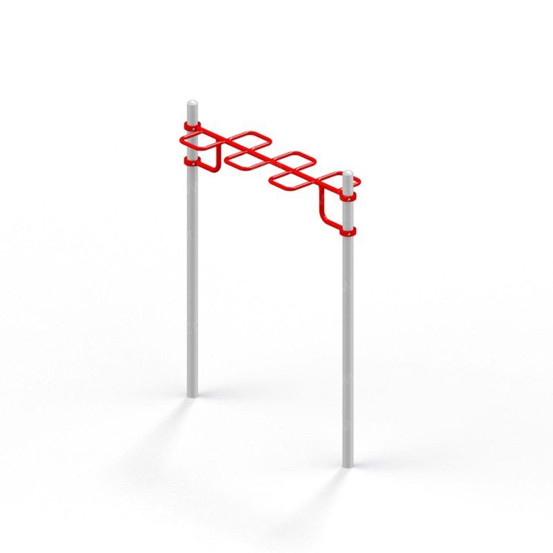 Конструкция включает в себя 2 опорные стойки и поперечную перекладину в виде извилистой металлической трубы, которая фиксируется на поверхности каждой стойки в 2-х местах. Сварные швы сглажены, чтобы ребенок не поранился при выполнении упражнений.