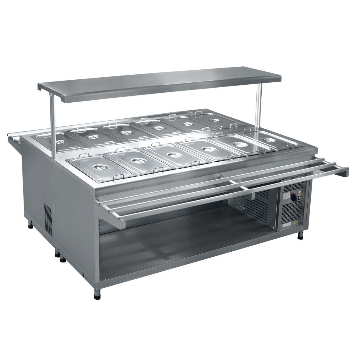 Охлаждаемый салат-бар, рассчитанный на 12 гастроемкостей, устанавливается на линии раздачи в столовой школы, ДОУ, иного муниципального учреждения. Имеет 1 полку с лампой подсветки. 12 гастроемкостей типоразмера GN 1/1 установлены в охлаждаемой столешнице в 2 ряда (по 6 гастроемкостей).