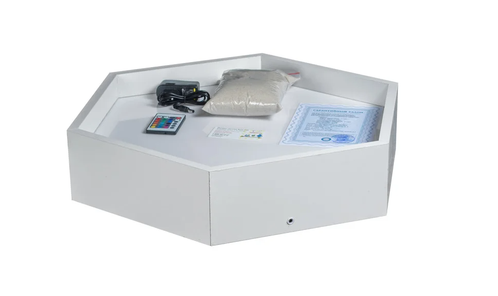 Корпус выполнен в форме шестиугольника. Поверхность из оргстекла выдерживает нагрузку песком, окружена бортиками. Стыки защищены от попадания мелких частиц. Оборудование подключается к розетке через блок питания. Напряжение 12 В. LED-подсветка настраивается с помощью пульта. Выбираются цвета (в том числе, белый), переливы, мерцание.