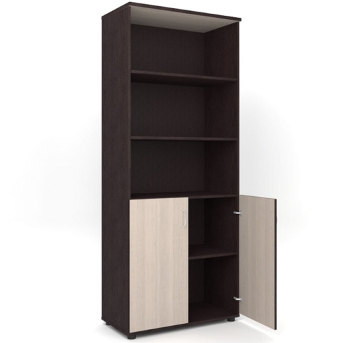 Полуоткрытый шкаф размещается в кабинетах ДОУ, школ, прочих муниципальных учреждений. Подходит для хранения пособий и документов; снабжен регулируемыми опорами. Имеет 3 полки; из них 2 — в верхней, открытой, части, и 1 полка внизу, за дверцами из ДСП.
