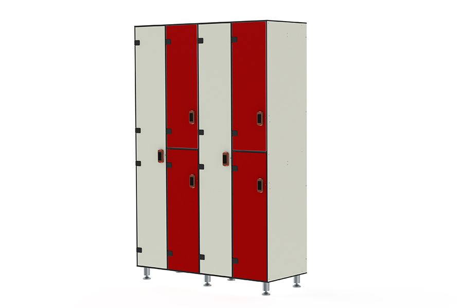 2 секции из 4-х делятся горизонтальной перегородкой на верхний и нижний ярус. Каждая ячейка оснащается полкой, крючком и дверцей на механическом замке. 2 другие секции представлены одним ярусом, оборудуются штангой для вешалок, полкой, крючком и дверцей на механическом замке.