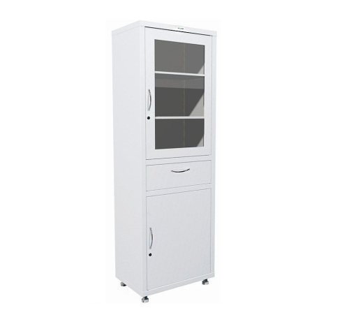 Металлический шкаф подходит для хранения медикаментов, инструментов, документов в медицинском или лабораторном кабинете.