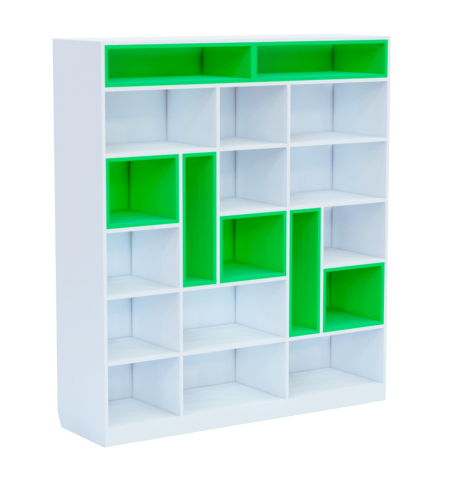 Предназначен для хранения книг, поделок и прочих материалов. Шкаф оснащен полками разных размеров, напоминающими тетрис, и предлагается в различных цветовых вариантах.