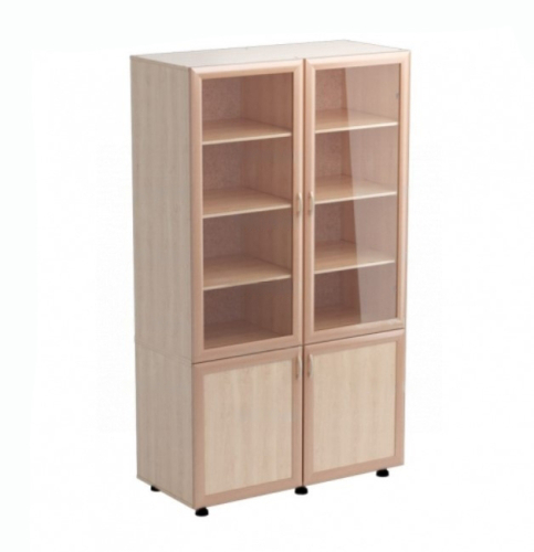 Шкаф имеет щитовую конструкцию, которая состоит из тумбы и неподвижно закрепленного на ней шкафа. Щитовые элементы изготовлены из ЛДСП, кромки облицованы ПВХ. Фасад выполнен из МДФ с прозрачной вставкой из поликарбоната.