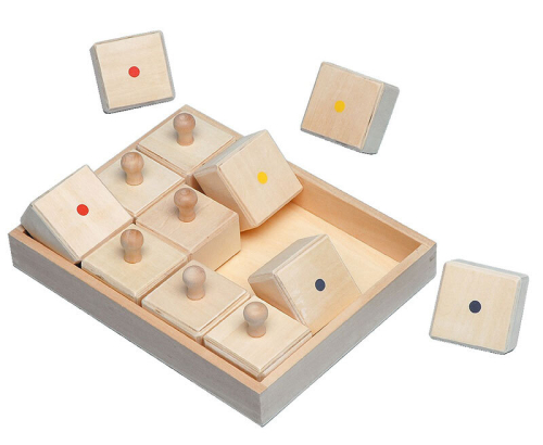 Дети знакомятся со звуками, которые издают предметы в закрытых ящиках, выявляют между ними соответствие. Метка на внутренней стороне ячейки помогает проверить точность выполнения заданий.