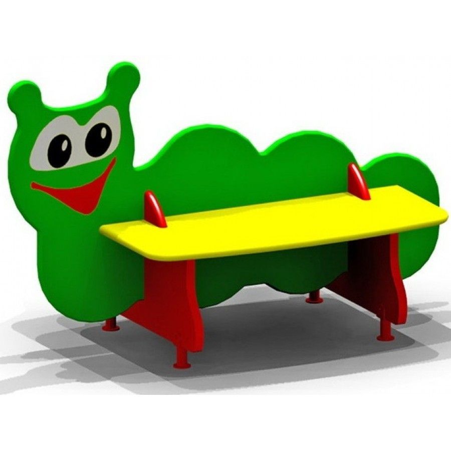 Корпус представлен фигурной панелью-спинкой с рисунком в виде гусеницы, по обе стороны от нее закрепляются сиденья со скругленными углами. Лавка вставляется в пазы 4-х фанерных опор, которые изображают ноги насекомого.
