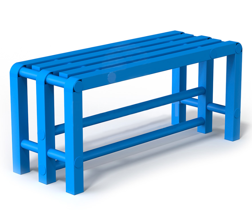 Скамья из влагостойкого материала подходит для раздевалки, бассейна или спортзала. Поверхность не выгорает под действием солнца. Тройные опоры укреплены 2-мя перекладинами. Углы сиденья закруглены.