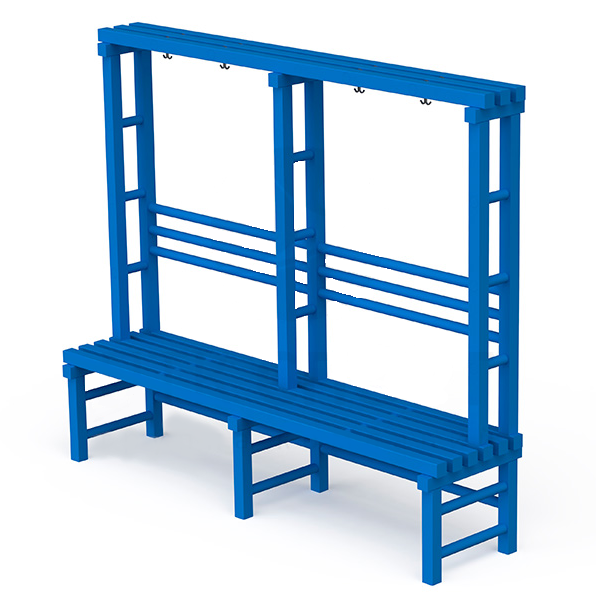 Конструкция служит скамьей для переодевания и вешалкой. Высота сиденья над полом 450 мм. 2-хсекционная прямоугольная рама наверху оснащена крючками. Вертикальные стойки секций и парные опоры укреплены перекладинами.