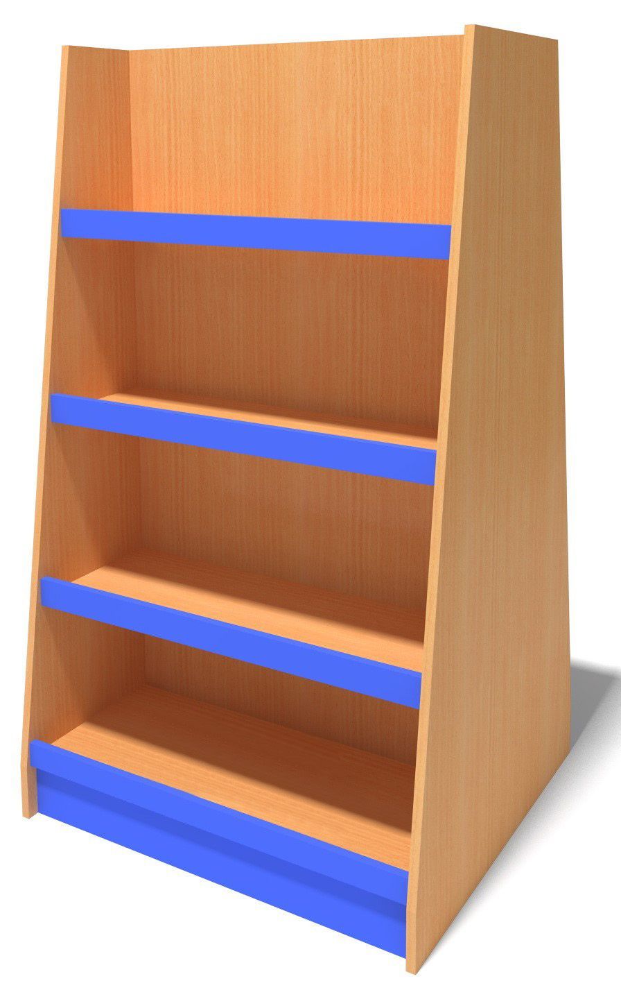 Книги, газеты, учебные пособия расставляются на 4-х полках полуоткрытого типа. Боковые стороны конструкции внизу расширяются, это повышает устойчивость стеллажа.