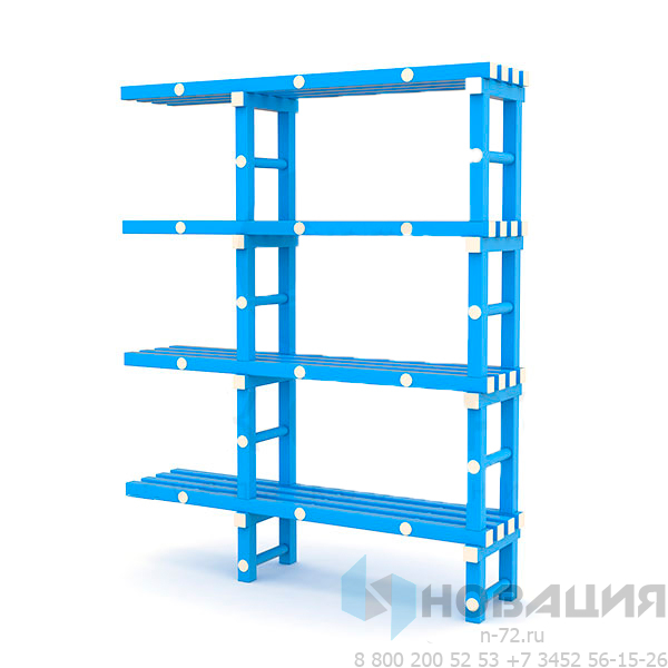 Стеллаж из профиля ПВХ (50х50 мм) оснащен заглушками. Пары стационарных опор соединяются перекладинами. В корпусе 3 сквозных отделения и 4 полуоткрытые полки. На поверхностях не скапливается пыль, здесь можно хранить влажные предметы, инвентарь для плавания.