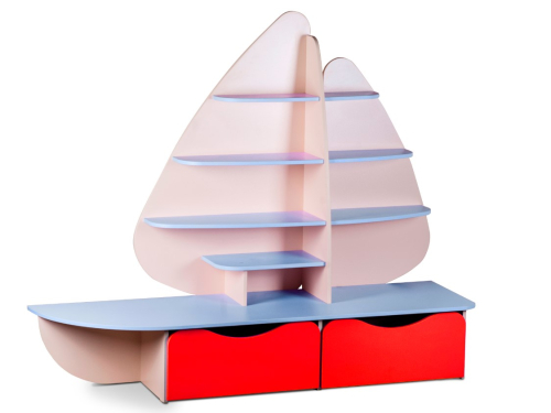 Стеллаж Парусник с 2-мя выкатными ящиками и большой панелью-палубой подходит для хранения игрушек и книг в ДОУ.