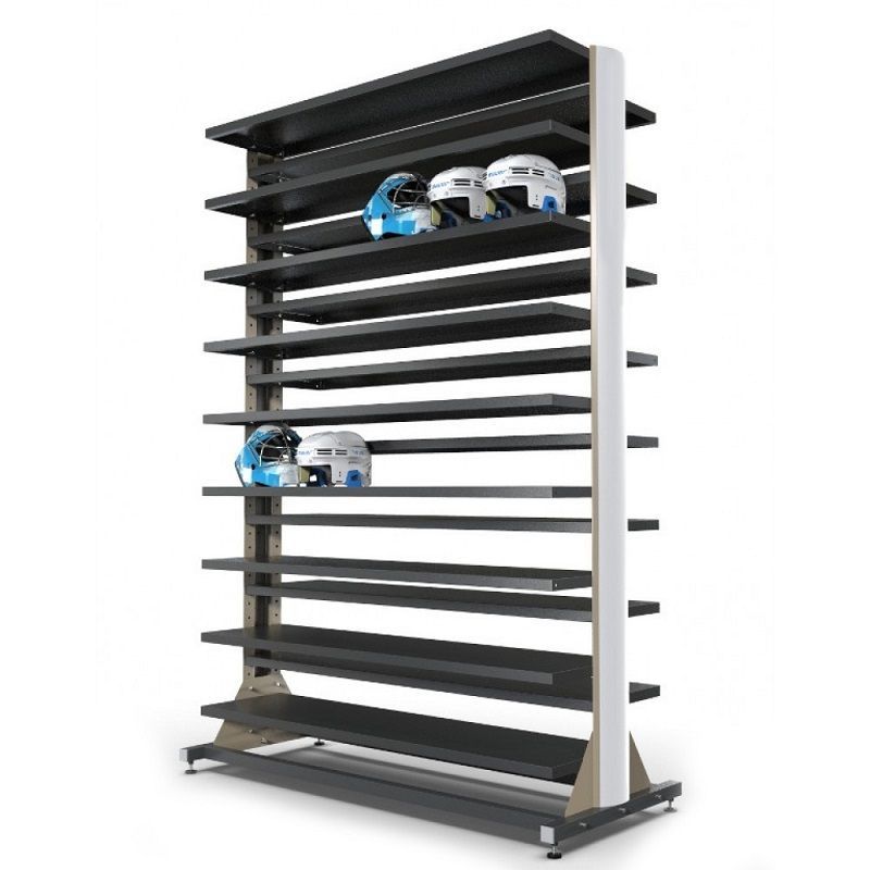 На горизонтальных полках хранятся шлемы разнообразных форм. Допускается хранить в просторных отделениях спортивную обувь. Влагостойкие поверхности покрыты порошковым покрытием.