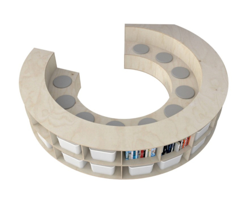 Стеллаж круглой формы оснащен местами для сиденья во внутренней части конструкции. Для удобства предусмотрены подушки (10 шт.), которые не крепятся к поверхности. Контейнеры для хранения не входят в комплект.