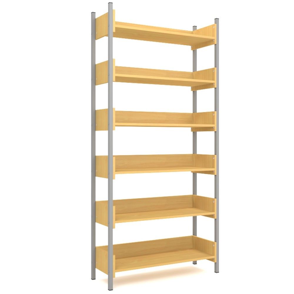 6 полок располагаются друг под другом, дополняются бортиками. Односторонняя конструкция займет место в школьной библиотеке. 4 боковые опоры окрашиваются в светло-серый цвет полимерно-порошковым покрытием.