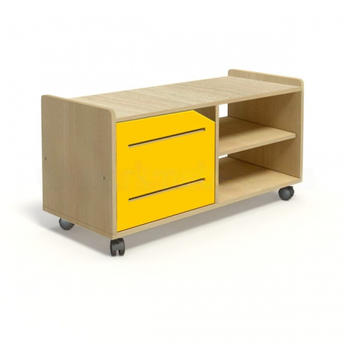 Внутри стеллажа могут храниться бумаги, дидактические наборы, заготовки для поделок, литература, игрушки. Топ изделия также используется в качестве полки: здесь размещается раздаточный материал, образцы творческих работ, комнатные растения.