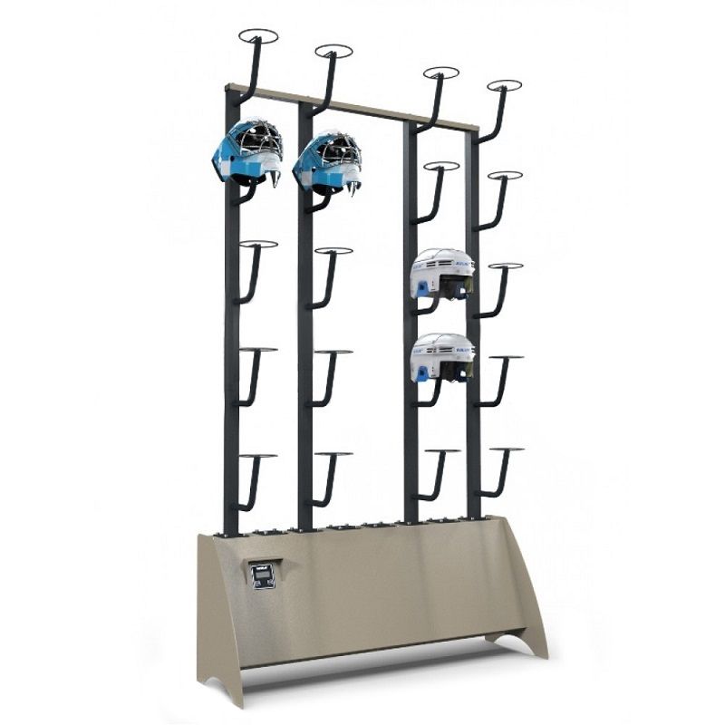 Стационарная сушильная установка прогревает шлемы воздухом, автоматическое отключение происходит через час эксплуатации.